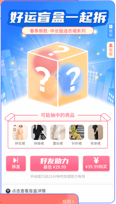 1.盲盒選擇:商家會在平臺上商家許多的盲盒商品,用戶在平臺上選擇自己喜歡的盲盒商品,選擇購買就可以開箱了,開箱時有開箱的特效。